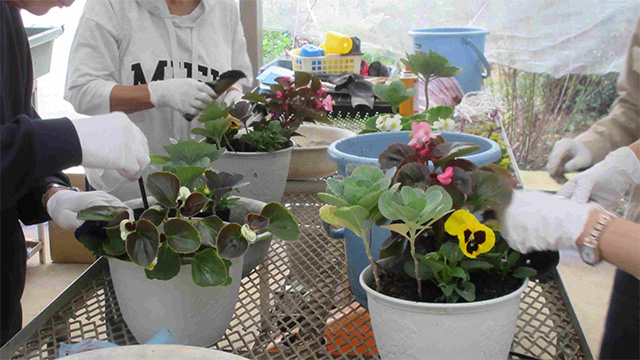 ・7号鉢にハボタン、パンジーを始め、花苗を含め、寄せ植え実習を行いました。