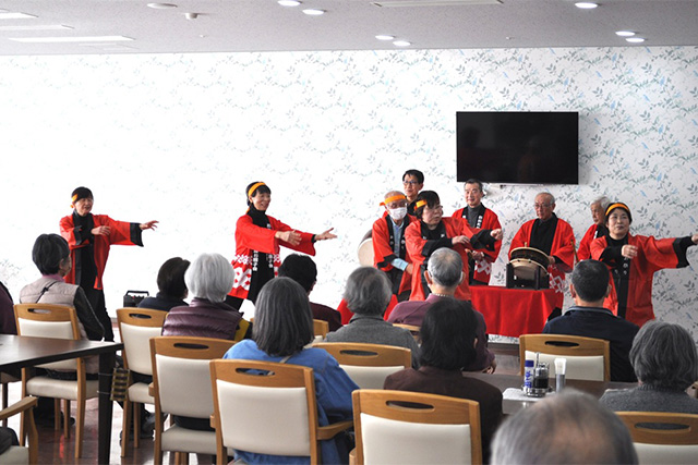 2月3日(火)、「地域活動専攻科」等の学生が流山市の介護付有料老人ホーム「ゆうゆうヴィラ・ナチュラ流山」でソーランの踊りやお囃子などを披露しました。同科はその名のとおり地域での活動の意義などを学ぶコースです。