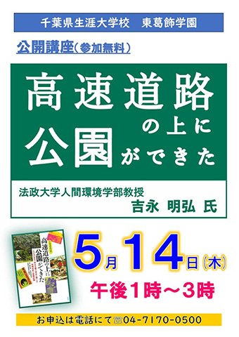 東葛飾学園では、こうしたボランティア体験を行うためのイベントを数多く企画しています。5月10日(日)には視覚障害者のための映画上映会への参加も計画されています。なお、5月14日(木)午後1時から3時まで法政大学人間環境学部の吉永明弘教授をお迎えし公開講座『高速道路の上に公園ができた』を行います。この公開講座は「千葉ふるさとづくり」コース2年生の環境を考える授業ですが、席に余裕があることから余った席を開放するのです。入場は無料ですが、席に限りがありますので事前に電話(04-7170-0500)でお申し込みください。