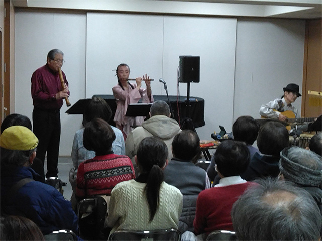 "心に響く篠笛とギター・パーカッションの音色尺八とのスペシャルコラボに拍手喝采!>"