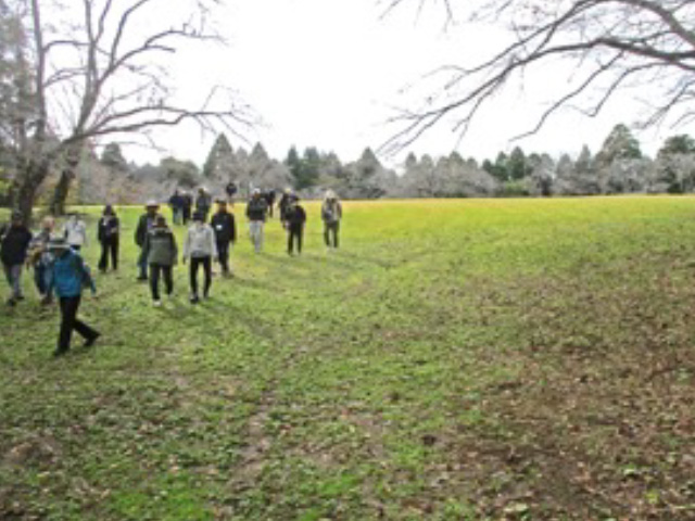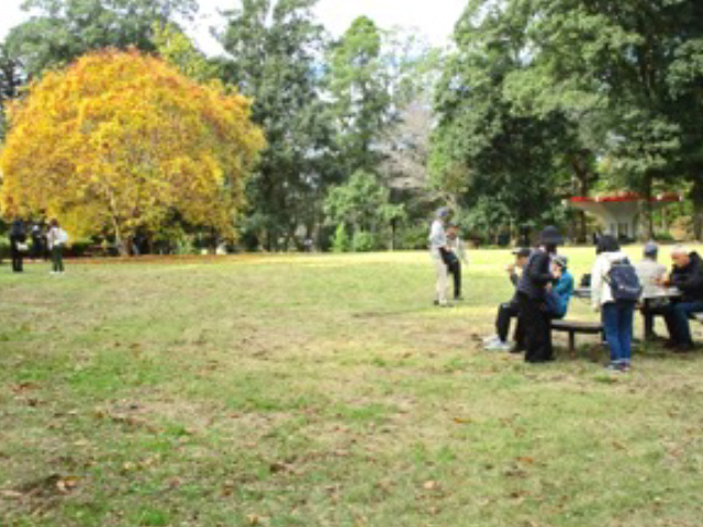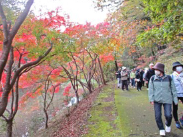 足元にはドングリがいっぱい落ちていて、ドングリの種類や樹木、野草を観察しながら、起伏のある道をゆっくり歩きました。池沿いのイロハモミジの紅葉が鮮やかで、カツラの落ち葉の甘い香りを味わいました。休憩を入れながらの約2時間の散策。秋を感じるひと時でした。